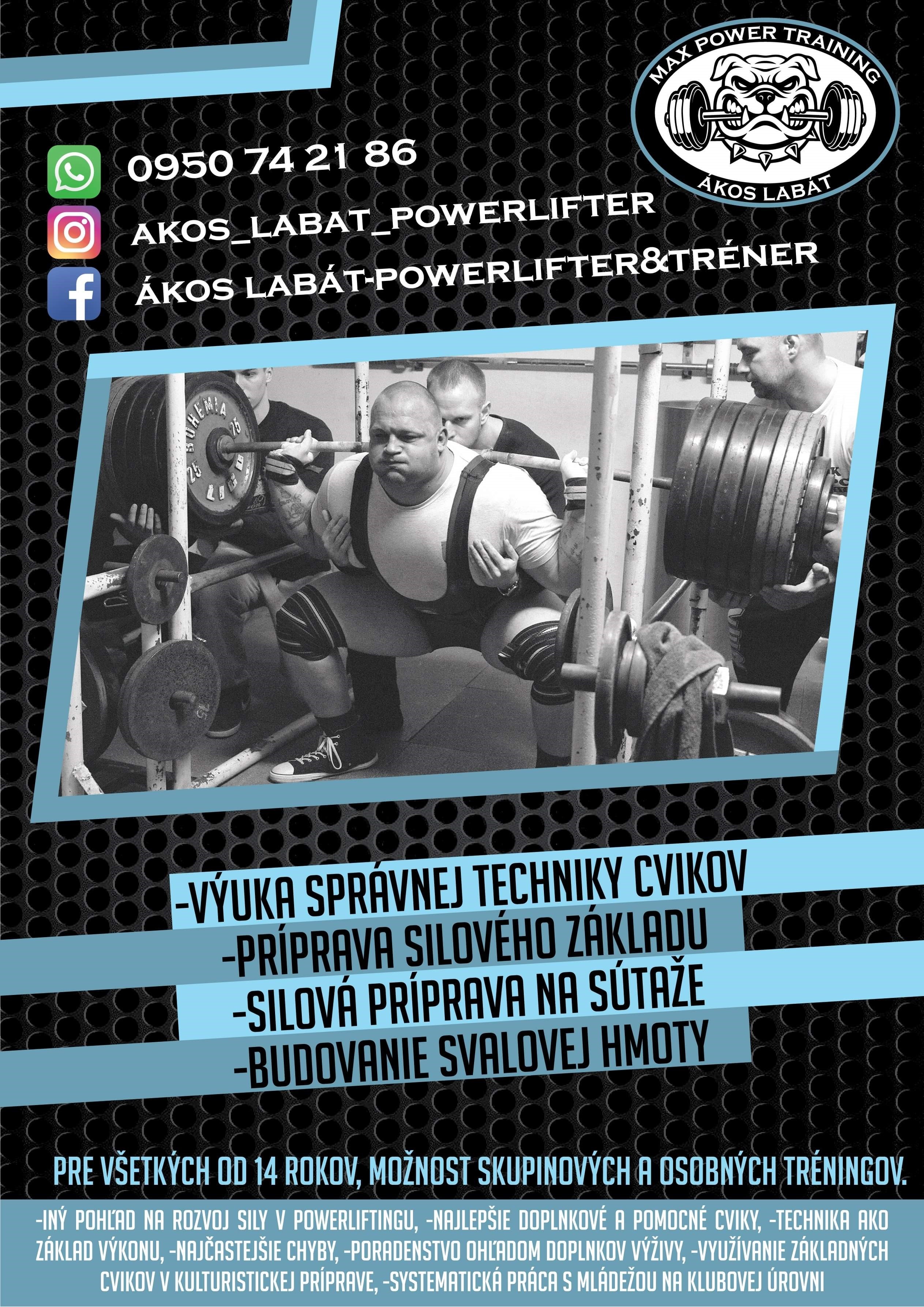 Primárne sa venujem silovému trojboju a budovaniu silového základu pre iné športy. Pomôžem aj s naberanim svalovej hmoty a doplnkami výživy. Som niekoľko násobným majstrom Slovenska a Česka, vicemajster Európy a sveta. Patrím medzi historicky najlepších trojbojarov slovenska. Všetko nájdete na mojej FB stránke Ákos Labát-powerlifter&tréner.